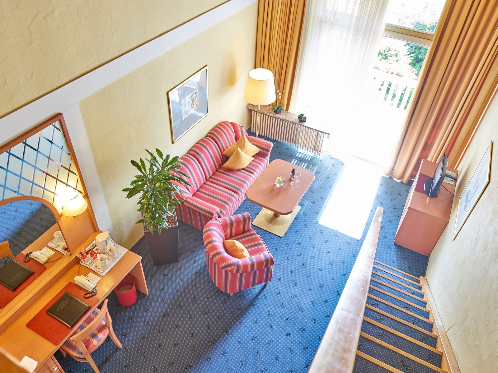 These rooms have a very comfortable double bed, 2 x 2.1m, located on the second level. They also have a cozy sitting area or couch and a balcony on the lower level, as well as a bathroom with tub or shower (and a hairdryer).